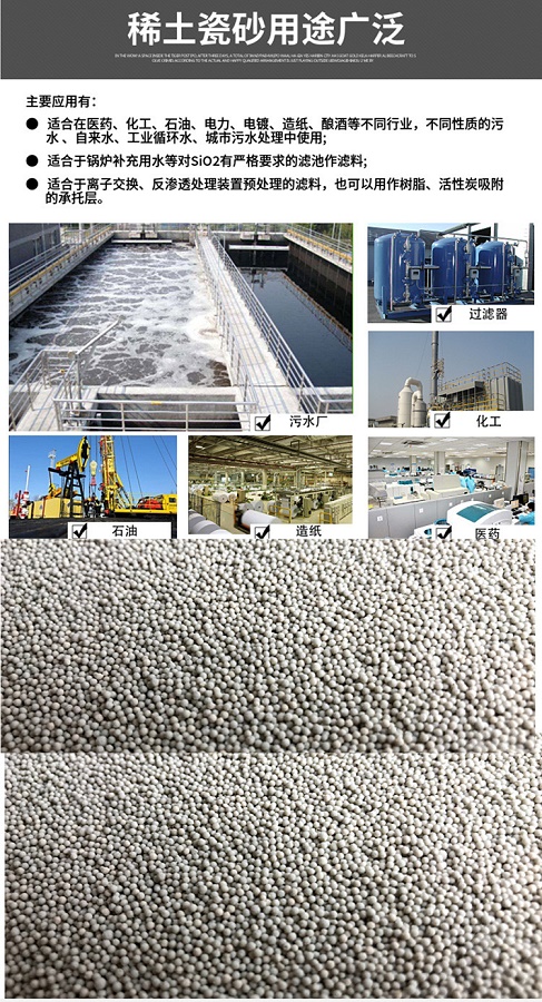 瓷砂濾料是一種球形顆粒,具有很好的穩(wěn)定化學(xué)性能,強(qiáng)度高,耐高溫 耐腐蝕比表面積大,截污吸附性能好,顆粒均勻,比重適中。稀土瓷砂濾料含油增強(qiáng)及耐腐蝕性的稀土,具有瓷砂濾料的性能外,吸附性能增強(qiáng),化學(xué)穩(wěn)定性能好,適合做反滲透過(guò)濾和超濾介質(zhì)。 在單層濾池 雙層濾池 雙層過(guò)濾器,離子交換器等過(guò)濾上班中作過(guò)濾介質(zhì)及墊層,可以處理各種工業(yè)污水 工業(yè)用水 城市污水等。