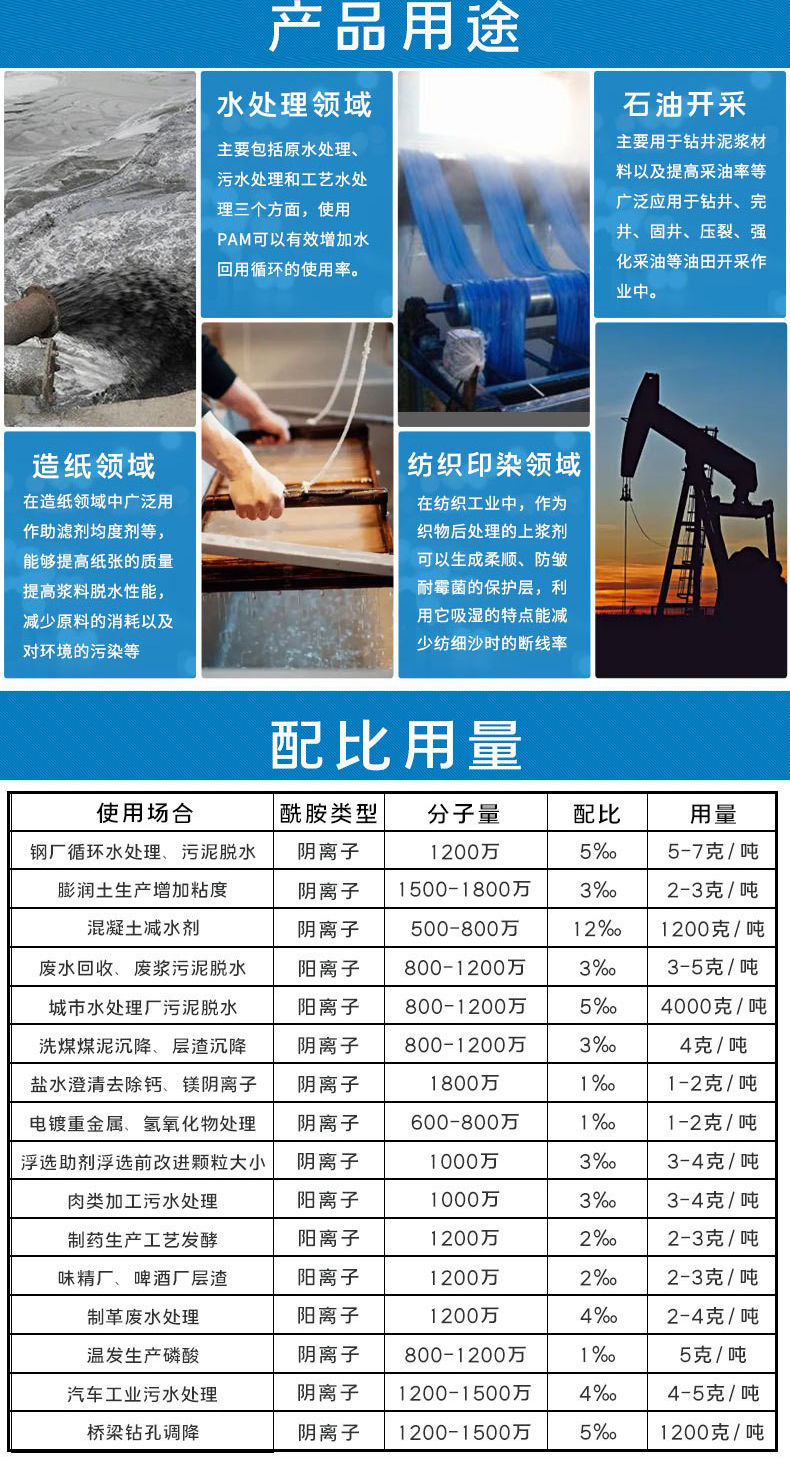 陽(yáng)離子聚丙烯酰胺通過(guò)交聯(lián)吸附的網(wǎng)狀結(jié)構(gòu),作為了一類(lèi)重要的絮凝劑  增稠劑  減阻劑  泥漿處理劑 表面活性劑 土壤改良劑,水土保濕劑 造紙 印染紡織增強(qiáng)劑等;在石油開(kāi)采  水處理 紡織造紙 選礦 醫(yī)藥等行業(yè)中廣泛用到。所以被稱(chēng)之為 百業(yè)助劑。